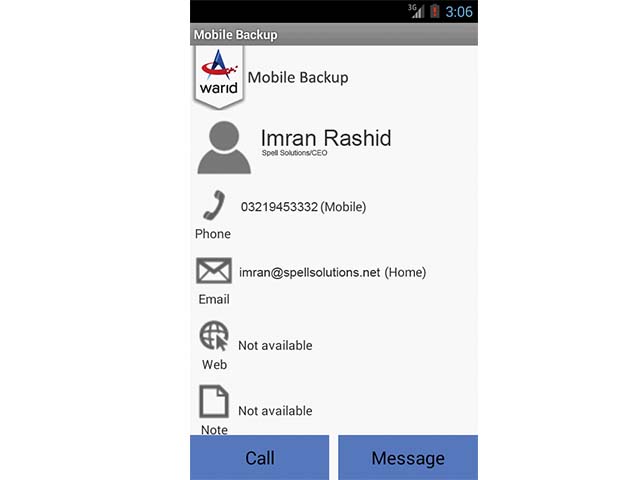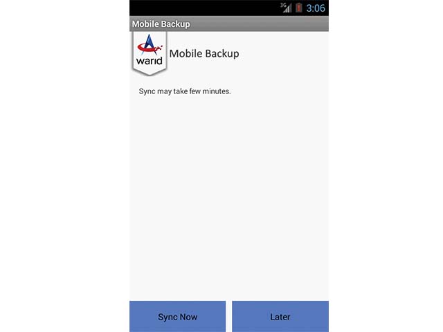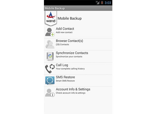 Warid brings you an exclusive service with phonebook, Call Log and SMS Backup.Use the Contacts Backup to store names, numbers, email addresses, and more. You can also access your contacts from web using http://mobilebackup.waridtel.com. Every time you take backup all your contacts are updated and you can restore your contacts whenever you want. Using our call log backup feature, you will never miss any call ever again, which takes back up of every dialed, received or missed call along with call duration, time, etc. And your synchronized contacts will be automatically linked to the Call Log to save you to memorize all the numbers.